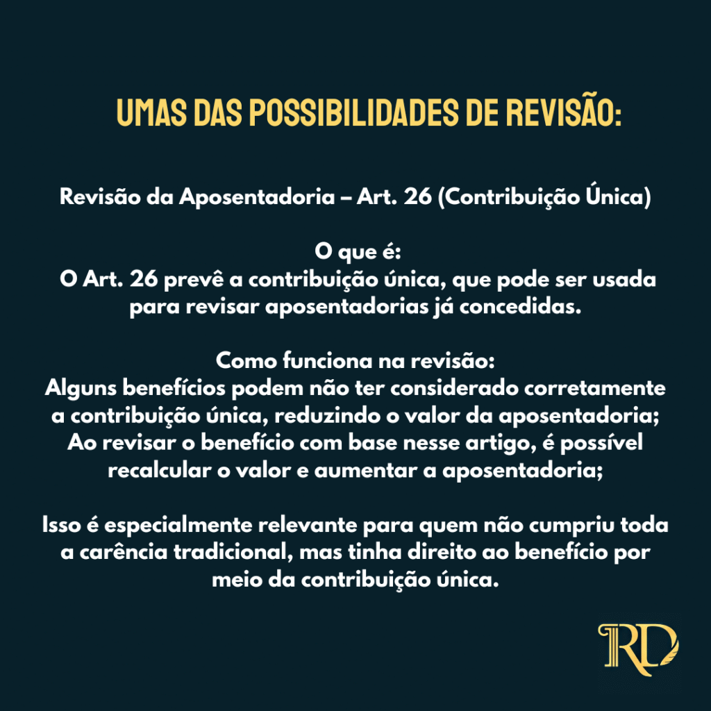 Uma situação importante é a chamada contribuição única, prevista no Artigo 26 da Lei 8.213/91. Ela ocorre quando o segurado fez apenas uma contribuição em determinado período — mesmo que isolada — e, ainda assim, essa contribuição deve ser levada em conta no cálculo da aposentadoria.